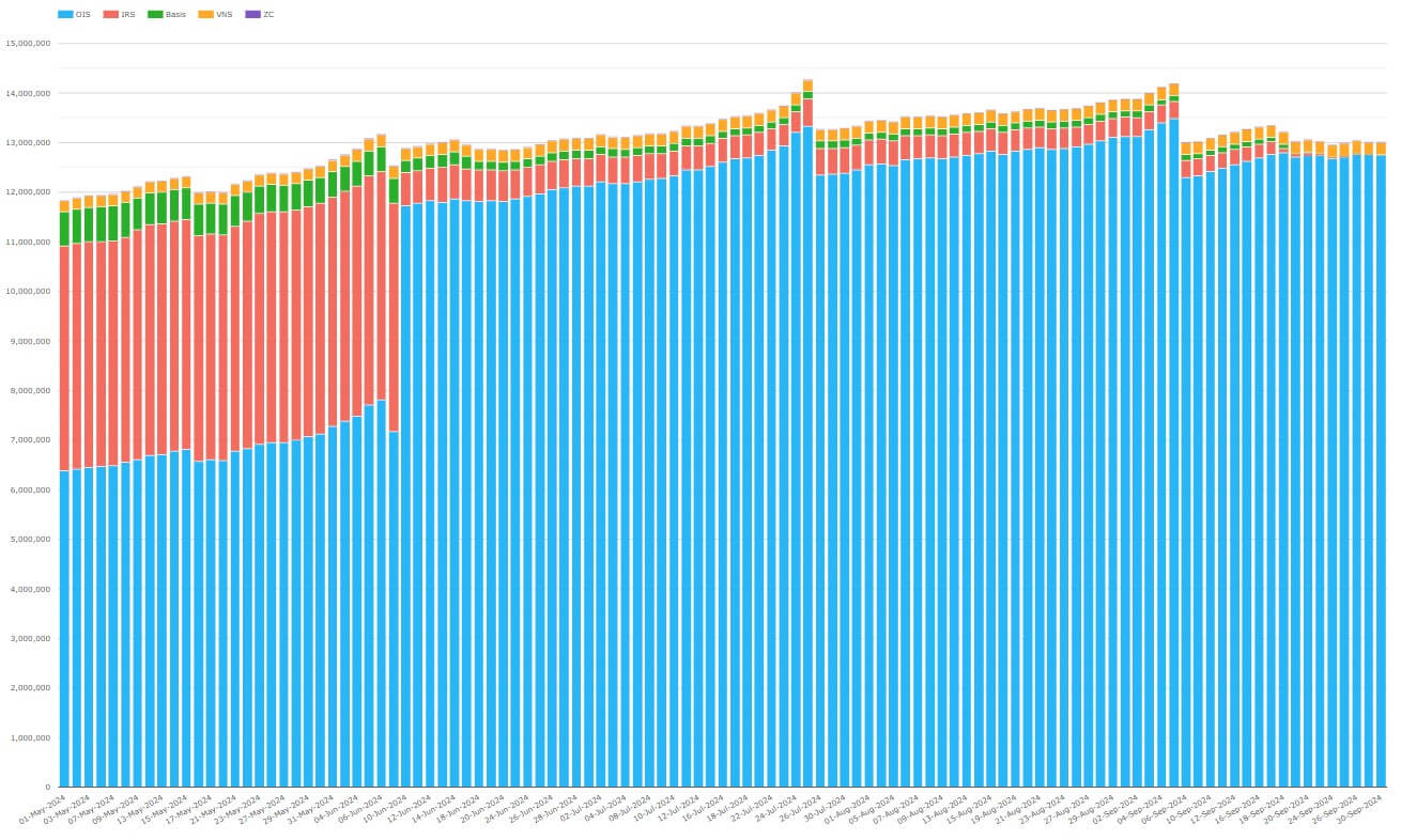 Both charts 2a and 2b show that a population of IRS remained after conversion and cessation until near the end of September. We can assume this was category 2 trades (with fixings only before cessation) running to maturity. Thus, the CAD swaps transition target state, limited to OI in only CORRA OIS and CORRA VNS, was reached by the end of September 2024.