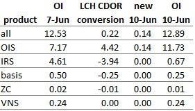 The OI figures in table 1 come from the same CCPView query as chart 2b, but we added new trades on 10 June from a separate query and inferred conversion figures by subtracting 7 June OI and 10 June new trades from 10 June OI. (We ignored for now any trades maturing on 10 June.)