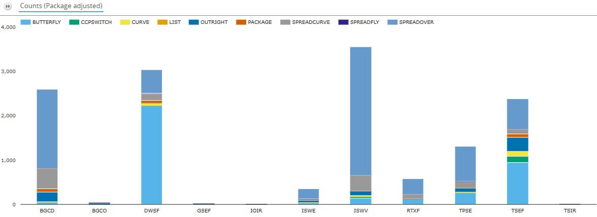- TP ICAP’s volumes (from IOIR, ISWE, ISWV, TPSE, TSIR) are led by spreadovers, then curve spreads (SPREADCURVE), then butterflies, then outrights.