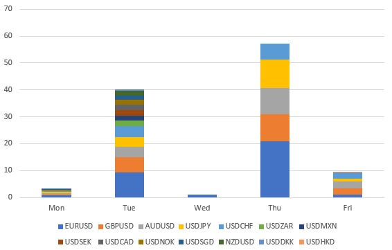 Chart 2a shows that DP NDFs execute almost exclusively on Tuesdays and Thursdays (apart from the tail off for the late December holiday period). There is a trickle of activity on other days in EUR/USD, GBP/USD, USD/JPY, and an occasional other pair.