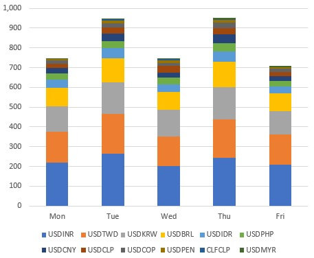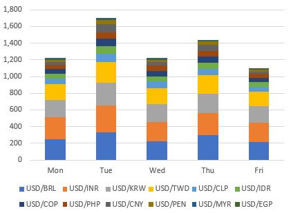 If those services normally run on Tuesdays or Thursdays each week, Clarus data are consistent with that hypothesis, and with those services using non-deliverable pair (NDP) NDFs.