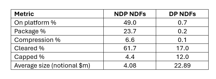 If the hypothesis is true, we can use NDP NDFs as a proxy for FX IM optimization behavior – showing the activity is off-platform, mostly uncleared, and has much larger than average trade size.