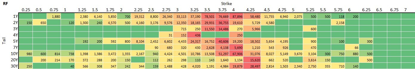 - The activity heatmaps show what can be done with SDRView trade data to show the most active USD swaption tails and strikes.