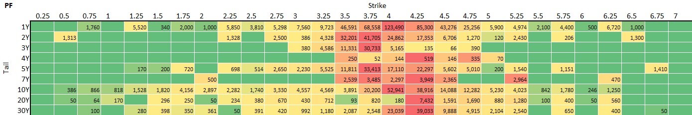 - 20Y tails were again more actively traded in receivers, which were 50 percent of 20Y tails activity versus 35 percent in payers. 20Y tails were highly concentrated in the 4.25 percent strike, which alone was 59 percent of the activity.