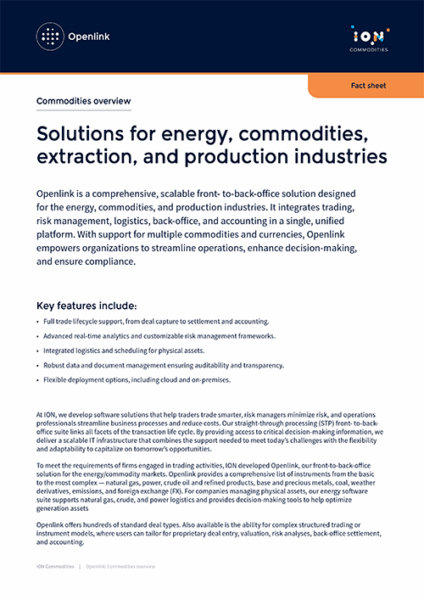 ION’s commodity management solutions deliver fast storage, company-wide inventory reports, and retrieval of massive data quantities. They can scale as transaction volumes grow and they provide aggregated real-time position reporting to keep pace with even the largest trading operations.