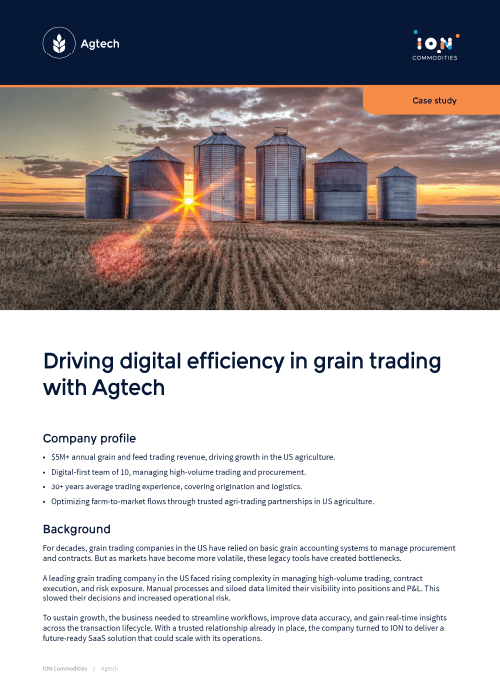 A major US-based grain trader modernized its grain and feed trading operations by implementing ION’s Agtech to replace manual workflows and siloed systems.