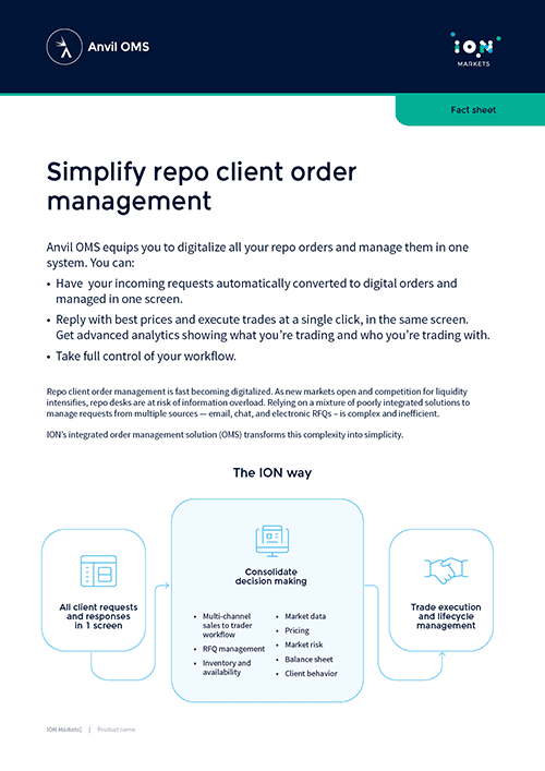 ION’s integrated order management solution gives you instant access to all the major repo venues around the world. You can build a clear sales-to-trader workflow and keep a record of every negotiation step. Now is the chance to scale your business with our modular technology architecture. Download the brochure to learn more.