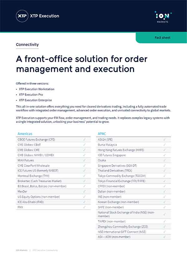 Our XTP Execution solution suite offers everything you need for cleared derivatives trading in a single location, with unrivaled global connectivity. Download the fact sheet to see how you can unlock your business’ potential.