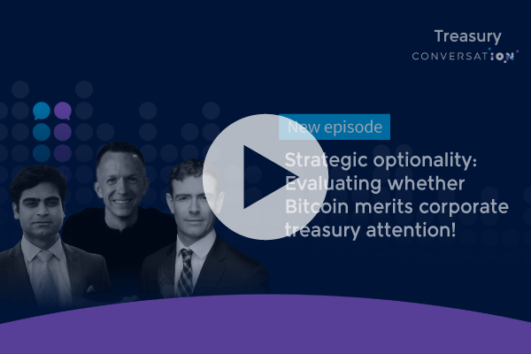 In this Treasury ConversatION podcast, ION’s Sourabh Verma and Chris Jackson discuss Bitcoin’s role in corporate treasury with Stephen Cole, CEO of Castle. Topics include Bitcoin’s evolution, volatility, inflation-hedge potential, and improved FASB guidance. The episode also covers stablecoins’ surge, with interesting use cases and savings when making cross-border payments. While adoption is limited, interest is growing!